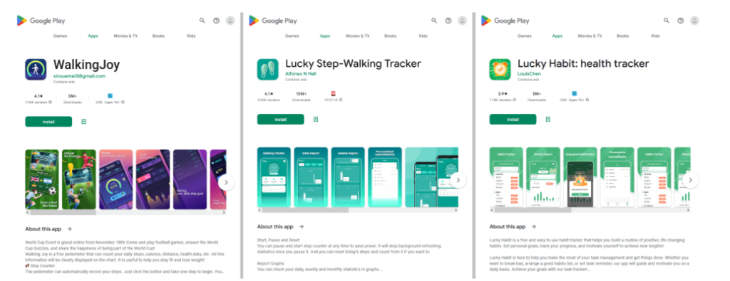 Un estudio publicado a principios de 2023 reveló varias aplicaciones sospechosas en Google Play con más de 20 millones de descargas entre ellas. Estas aplicaciones se anunciaban principalmente como rastreadores de salud y prometían a los usuarios recompensas en efectivo por caminar y otras actividades, así como por ver anuncios o instalar otras aplicaciones. Más concretamente, el usuario recibía puntos por realizar estas acciones, que supuestamente podían convertirse después en dinero real. El único problema era que para obtener una recompensa era necesario acumular una cantidad tan grande de puntos que en la realidad era imposible lograrlo.