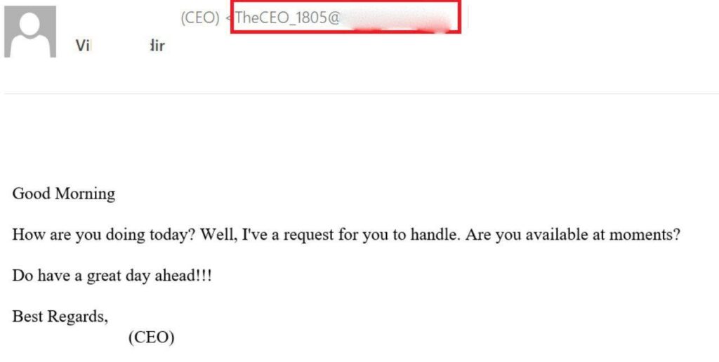 El mensaje anterior es un ejemplo de “la estafa del CEO” a gran escala. En este escenario, un empleado recibe un correo electrónico falso de un colega de mayor rango. El mensaje siempre es poco claro y dice que hay una solicitud que manejar. Se le puede pedir a la víctima que pague urgentemente algún contrato, resuelva algún conflicto financiero o comparta información confidencial con un tercero. Cualquier empleado puede potencialmente convertirse en una víctima. Por supuesto, hay varias banderas rojas notables en dicho mensaje. No se emplea ninguna cuenta corporativa y se nota que el remitente no es un hablante nativo.