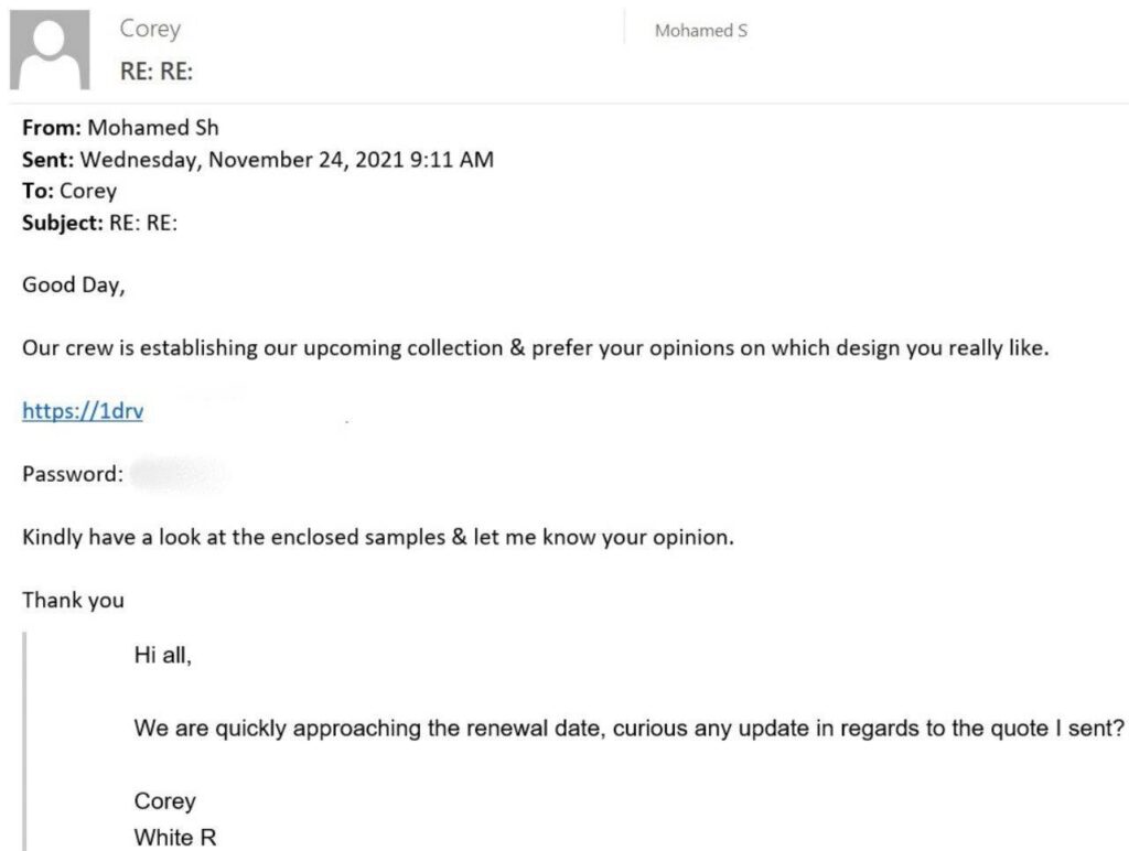 Así como algunos delincuentes se valen de envíos masivos de correos simplificados, otros recurren a ataques BEC más avanzados y dirigidos. El proceso funciona de la siguiente manera: los atacantes primero atacan un buzón intermediario y obtienen acceso al correo electrónico de esa cuenta. Entonces, cuando encuentran una correspondencia adecuada en el buzón comprometido de la empresa intermediaria (por ejemplo, asuntos financieros o problemas técnicos relacionados con el trabajo), continúan la correspondencia con la empresa objetivo, haciéndose pasar por la empresa intermediaria. A menudo, el objetivo es persuadir a la víctima para que transfiera dinero o instale malware.