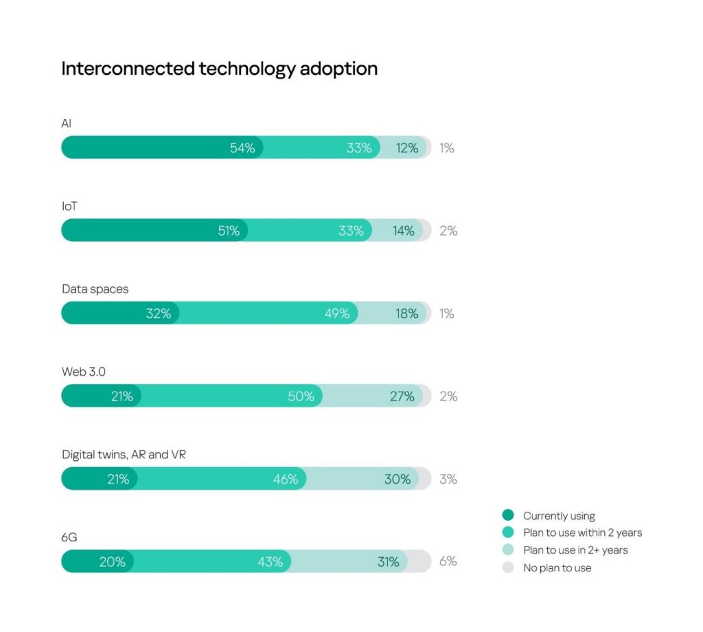Otras tecnologías interconectadas (gemelos digitales, RA, RV, web 3.0), solo son utilizadas por tres de cada 10 (28%) empresas en América Latina, pero cerca del 70% está considerando la posibilidad de integrarlas pronto en sus procesos empresariales.