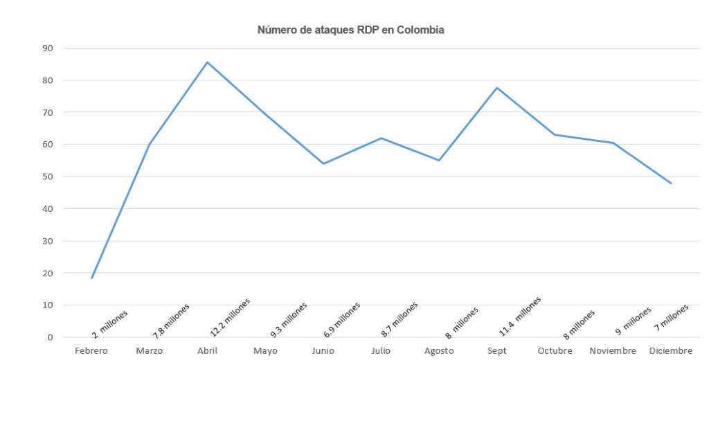 El Protocolo de Escritorio Remoto (RDP, por sus siglas en inglés) es quizá el más popular, ya que se utiliza para acceder a Windows o a los servidores. Después de la migración al trabajo remoto, los ataques de fuerza bruta contra este tipo de protocolo crecieron significativamente en todo el mundo en comparación con el período pre-pandémico (aunque hubo una caída en el último trimestre de 2020). En el caso específico de Colombia, el año pasado se registraron 91.6 millones de ataques.