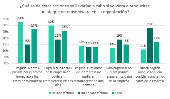 Según el informe, si una organización ha sido víctima de ransomware en el pasado, es más probable que pague un rescate que en caso de un nuevo ataque (88%). Estas empresas también son más proclives a pagar lo antes posible para obtener un acceso inmediato a sus datos (el 33% de las empresas atacadas anteriormente frente al 15% de las empresas que nunca han sido víctimas), o a pagar después de sólo un par de días de intentos infructuosos de descifrado (el 30% frente al 19%).