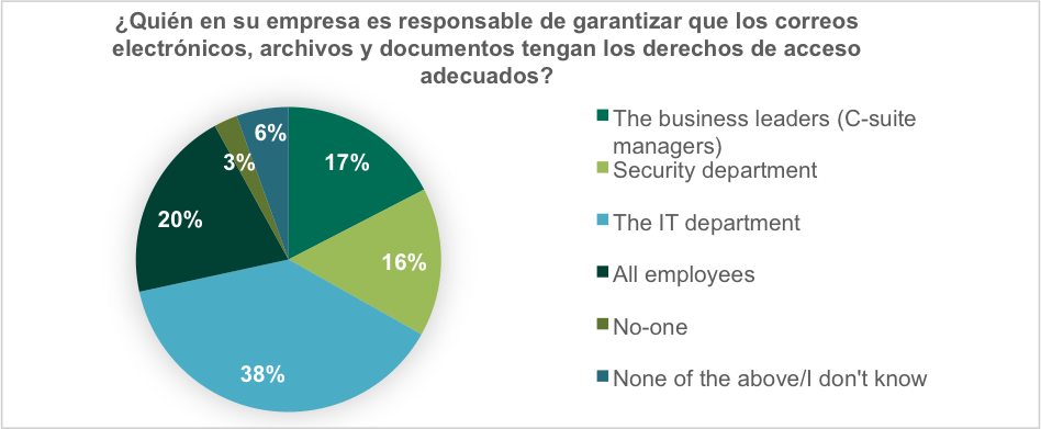 El desorden digital incluye los archivos, documentos y datos creados en el trabajo sin la visibilidad o el control total de la empresa sobre cómo se almacenan y quién tiene acceso a ellos. Se convierte en un riesgo de seguridad cuando consideramos que el 72% de los empleados almacena documentos en el trabajo que contienen datos de identificación personal o confidenciales, los cuales, si llegarán a filtrarse, podrían dañar, tanto en su reputación como en sus finanzas, a una empresa, a sus empleados y, potencialmente, a sus clientes. Abordar el desorden digital es un desafío para las empresas y uno de los pasos más importantes es comprender quién es responsable de ello. Casi tres cuartas partes (71%) de los empleados creen que los líderes empresariales, el equipo de TI o el de seguridad deben ser responsables de garantizar que los correos electrónicos, archivos y documentos tengan los derechos de acceso adecuados, en lugar de hacerlo ellos mismos. El problema es que si bien los equipos de TI y de seguridad pueden controlar el acceso dado a los empleados para entrar a los archivos y carpetas, también hay espacio para el error humano. Ya sea accidental o intencionalmente, por ejemplo, los empleados podrían darles a sus colegas o personas ajenas a la empresa credenciales para el acceso o evadir a los administradores de TI con nuevas herramientas de colaboración. Y como hay empleados creando y colaborando en varios documentos simultáneamente, todos deben asumir responsabilidad por sus acciones que causan el desorden digital.