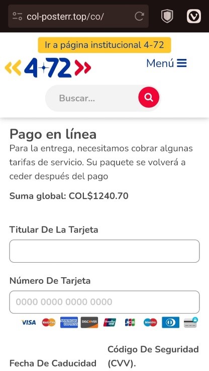 El mensaje de texto contiene un enlace que parece dirigir a una página legítima de 4-72, una conocida empresa de envíos. Sin embargo, esta página es en realidad una imitación fraudulenta y en ella se solicita a las víctimas que realicen un pago para recibir el paquete.
