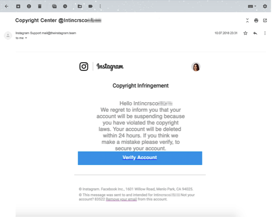 Se trata de un esquema de phishing que secuestra los perfiles de las personas con un alto número de seguidores en Instagram, tras enviarles una falsa notificación de violación de derechos de autor. “Su cuenta se eliminará permanentemente por infracción de derechos de autor”, afirma una notificación por correo electrónico que parece muy oficial. Es más, cuenta con el encabezado y el logotipo habitual de Instagram, y la dirección de correo electrónico de quien envía es muy parecida a la legítima: en la mayoría de los casos es mail@theinstagram.team o info@theinstagram.team.