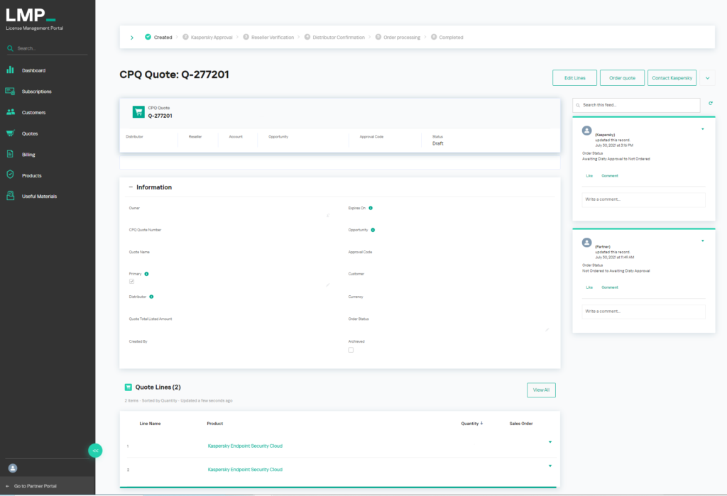 La actualización del LMP también simplifica la experiencia de los distribuidores mayoristas. Si bien su función sigue siendo la misma, es decir, ayudar a los socios en cuanto al proceso de ventas y desarrollo de negocios, estos pueden ahorrar tiempo en las aprobaciones de rutina, centrándose en el desarrollo de su negocio. En vez de crear y confirmar pedidos en la herramienta de gestión de pedidos del proveedor, los distribuidores solo necesitan realizar un clic para confirmar la colocación del pedido a través del LMP después de verificar los términos financieros del socio. El tablero de control proporciona toda la información necesaria sobre los pedidos de un socio en particular, así como la capacidad de comunicarse con Kaspersky o el socio si fuera necesario.