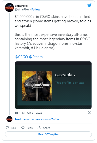 El pasado 21 de junio, un usuario de Twitter –bajo el nombre de ohnePixel – reportó que se habían robado más dos millones de dólares en skins de CS:GO de una cuenta pirateada. Entre los objetos robados se incluyen una variedad objetos “raros” como Souvenir AWP Dragon Lore, la skin más cara de CS:GO, que puede alcanzar cientos de miles de dólares.