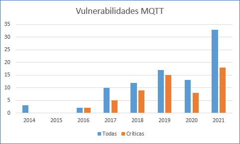Desde 2014, se han descubierto 90 vulnerabilidades en el MQTT, incluso críticas, muchas de las cuales siguen sin recibir parches hasta el día de hoy. En 2021, se descubrieron 33 nuevas vulnerabilidades, entre ellas 18 críticas, 10 más que en 2020. Todas estas vulnerabilidades ponen a los pacientes en riesgo de que les roben sus datos.