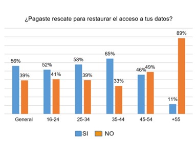 El año pasado, el porcentaje de víctimas a nivel global que pagó el rescate para restaurar el acceso a sus datos fue más alto entre las personas de 35 a 44 años con 65% que admitió haber pagado. Esto se compara con poco más de la mitad (52%) de las personas de 16 a 24 años y solo el 11% de las personas mayores de 55, lo que muestra que los usuarios más jóvenes son más propensos a pagar un rescate.