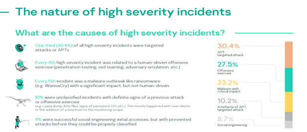 Casi un tercio (30%) de estos incidentes críticos fueron ataques dirigidos por personas. Cerca de una cuarta parte (23%) de los incidentes de alta gravedad se clasificaron como estallidos de malware de alto impacto, incluido el ransomware. En el 9% de los casos, los ciberdelincuentes accedieron a la infraestructura informática de una empresa utilizando técnicas de ingeniería social.